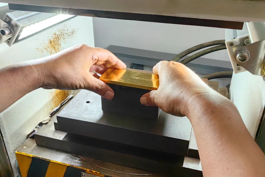 等金錠擦拭完畢,后續(xù)要在金錠上打鋼印,算是給每塊金錠一個身份認證。最后在經(jīng)過表觀檢驗之后,這樣一塊1千克的標準金錠就可以出貨了。